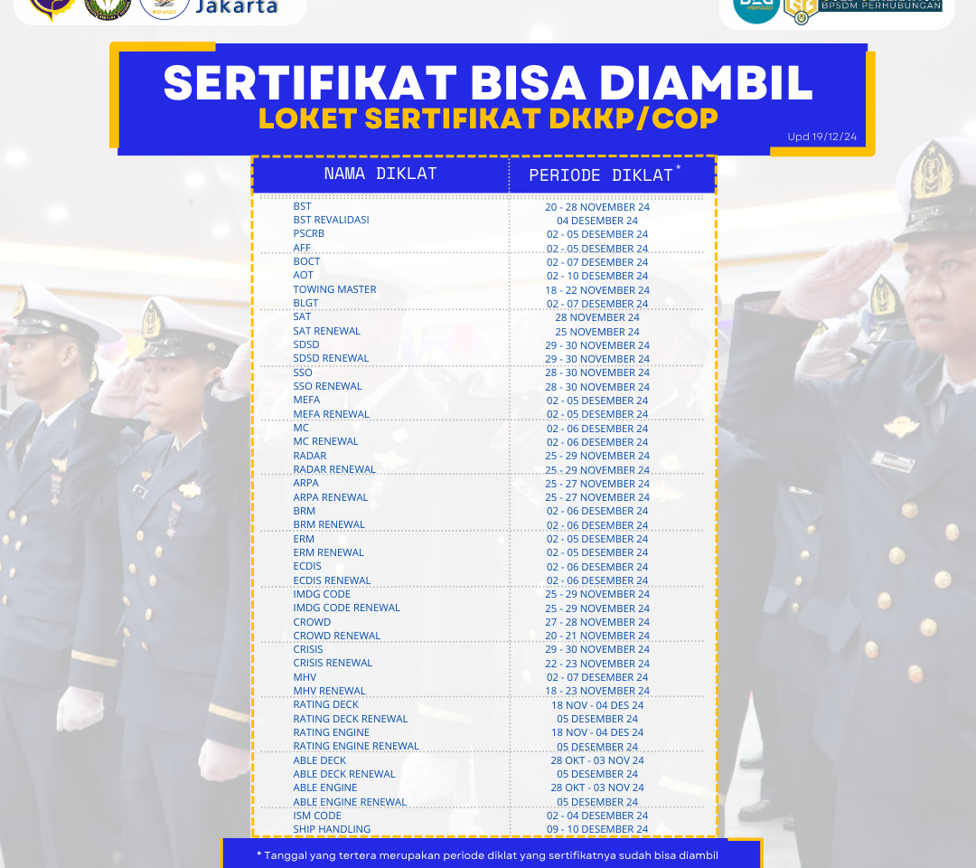 Untuk periode yang tertulis pada postingan mimin merupakan periode diklat yang sertifikatnya sudah bisa diambil yaa. Untuk periode sebelum yang tertulis berarti sudah dapat diambil sertifikatnya yaa..