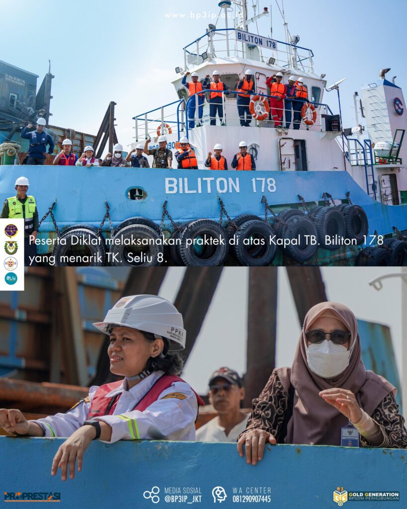 Peserta Diklat melaksanakan praktek di atas Kapal TB. Biliton 178 yang menarik TK. Seliu 8.