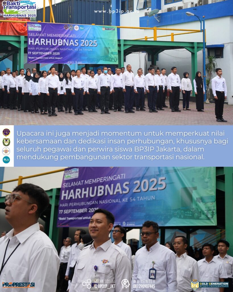 Rabu (17/9), Balai Besar Pendidikan Penyegaran dan Peningkatan Ilmu Pelayaran (BP3IP) melaksanakan Upacara Peringatan Hari Perhubungan Nasional 2025 di Lapangan Bintang BP3IP.