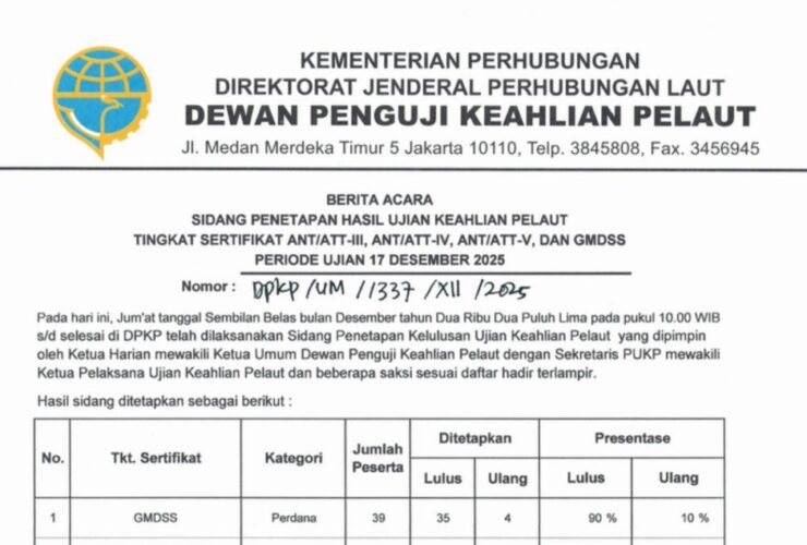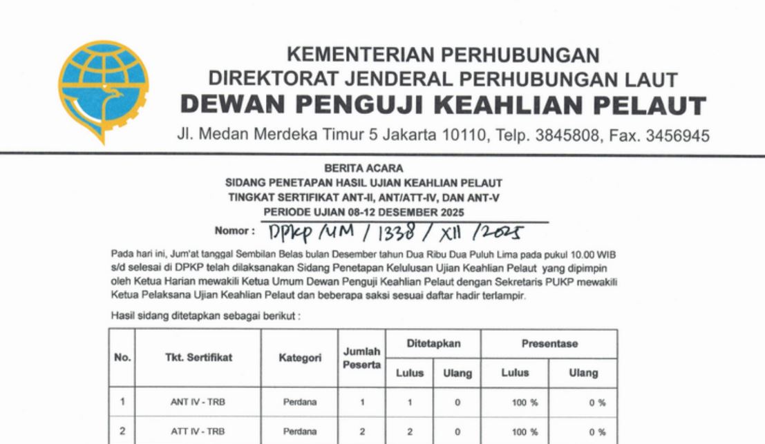 Pengumuman Hasil Ujian Keahlian Pelaut Tingkat ANT-II, ANT/ATT-IV dan ANT/ATT-V Periode Ujian 08-12 Desember 2025