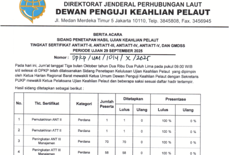 Pengumuman Hasil Ujian Keahlian Pelaut Tingkat ATT II, ATT III, ATT IV, ATT V ,dan GMDSS Periode Ujian 22-26 Sepember 2025